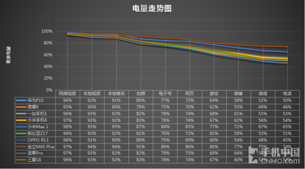 而在一些不太依靠CPU长时间负荷工作中的检测中,例如手机微信视频等,金立M6S Plus的大充电电池便能充分发挥神效。在这儿,也要夸奖一下一加手机5和nubiaZ17这2款手机上,尽管电池电量不占优势,但续航力主要表现也十分非常好,也有小米手机6和三星S8也很优异,这种手机上的相同点是都配用了骁龙835移动应用平台。