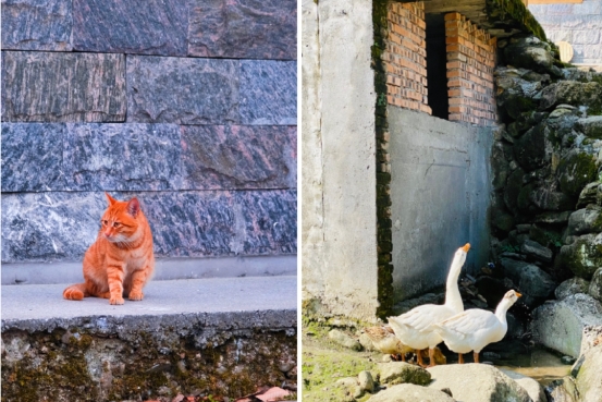 村内石板小道蜿蜒,橘猫、大白鹅等小动物悠闲踱步,仿佛 “村主人” 般自在;家家户户房前屋后种满绿植,流水淙淙穿村而过,阳光洒落时溪水波光粼粼。春夏秋三季,不少家庭在此露营野餐,与自然亲密接触;农家乐的特色菜肴更不容错过 —— 熏猪肉锁住了柴火的香气,轻轻一咬便有汁液迸发,水磨豆腐由新鲜黄豆手工打磨,细腻爽滑且豆香浓郁。一日之内,可在古树下纳凉、溪水边漫步、品尝农家菜,感受 “遗世独立” 的闲适。